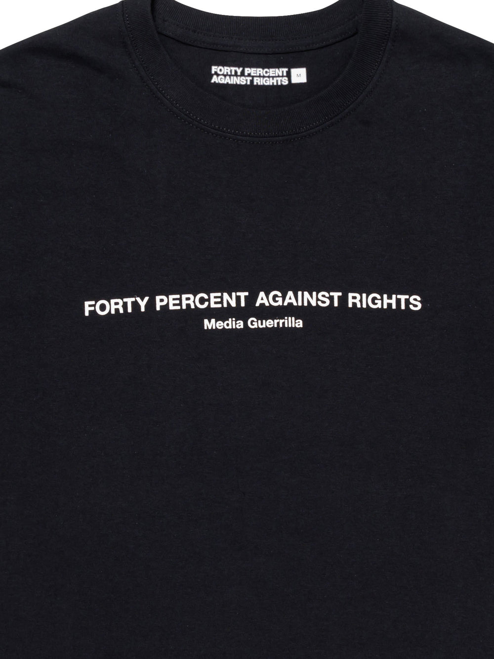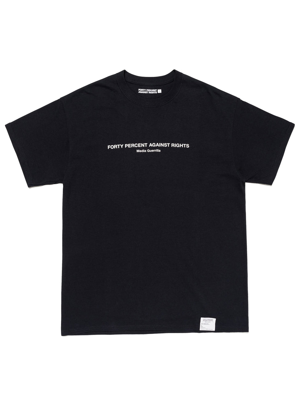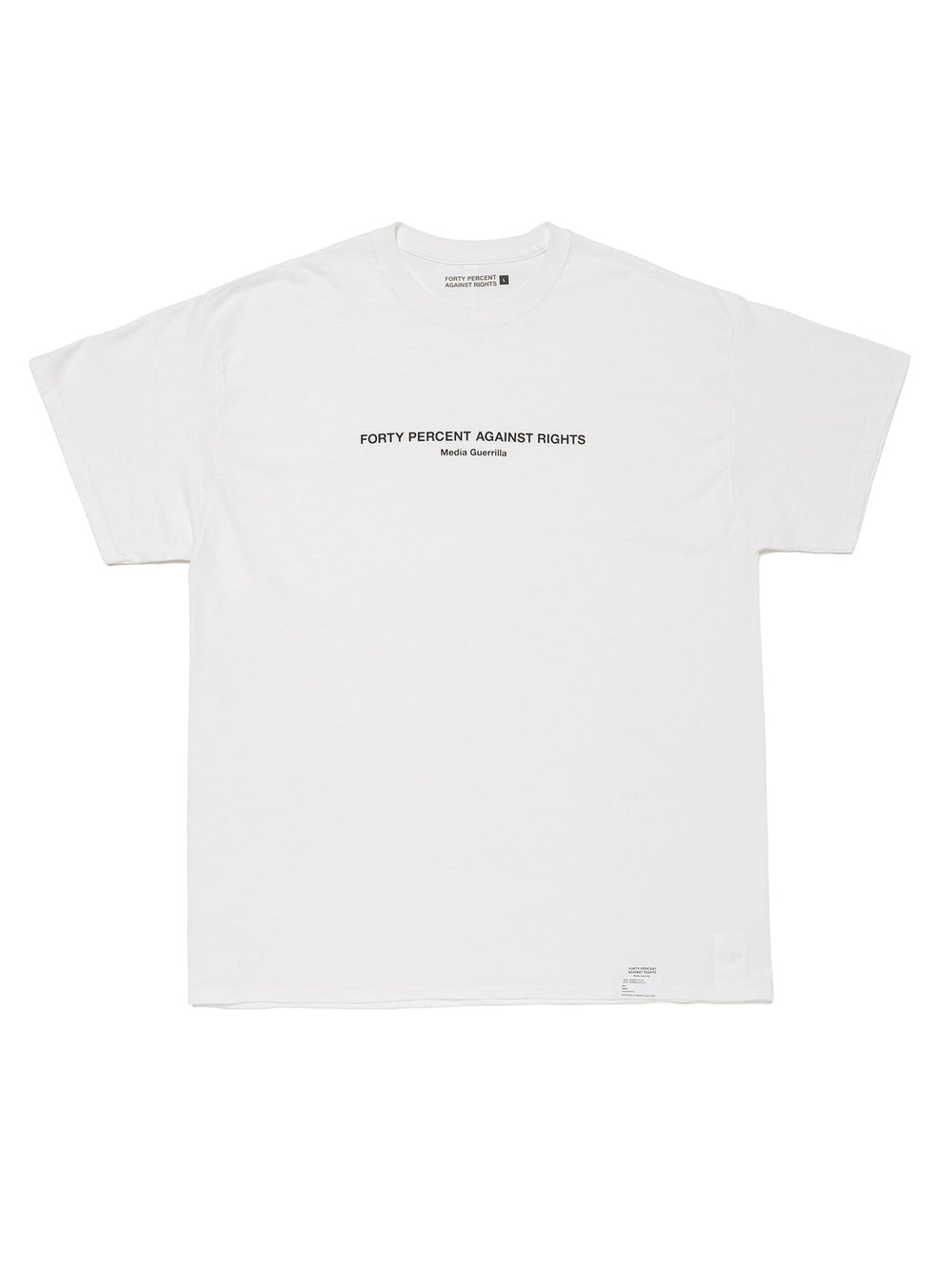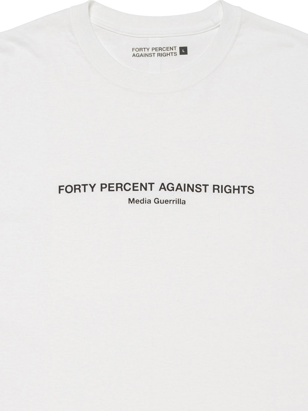 FORTY PERCENT AGAINST RIGHTS / Media Guerrillaのロゴを前面にプリントしたコットン天竺のショートスリーブTシャツ。後ろ襟の直下にはランドリーチケットを模したネームをプリント。