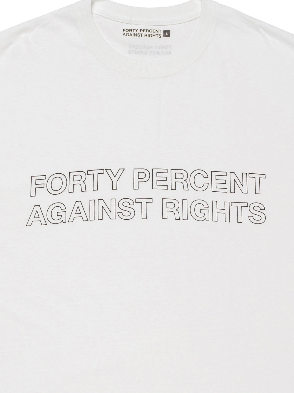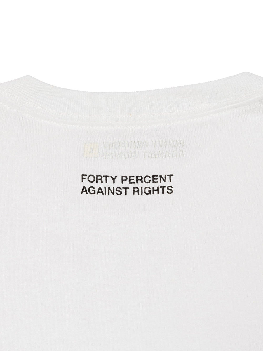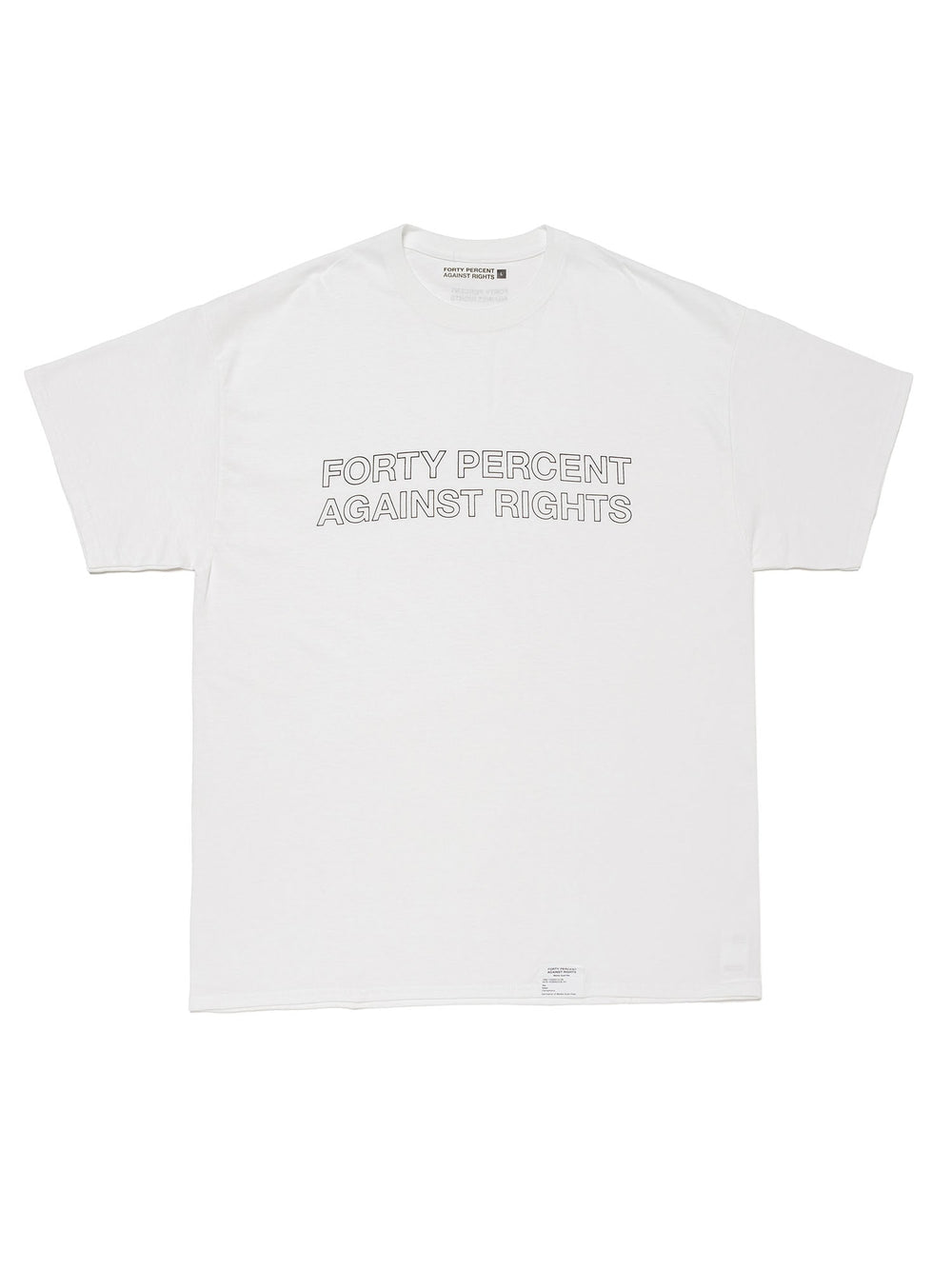 FORTY PERCENT AGAINST RIGHTSのアウトラインロゴを前面に、バナーロゴを背面にプリントしたコットン天竺のショートスリーブTシャツ。